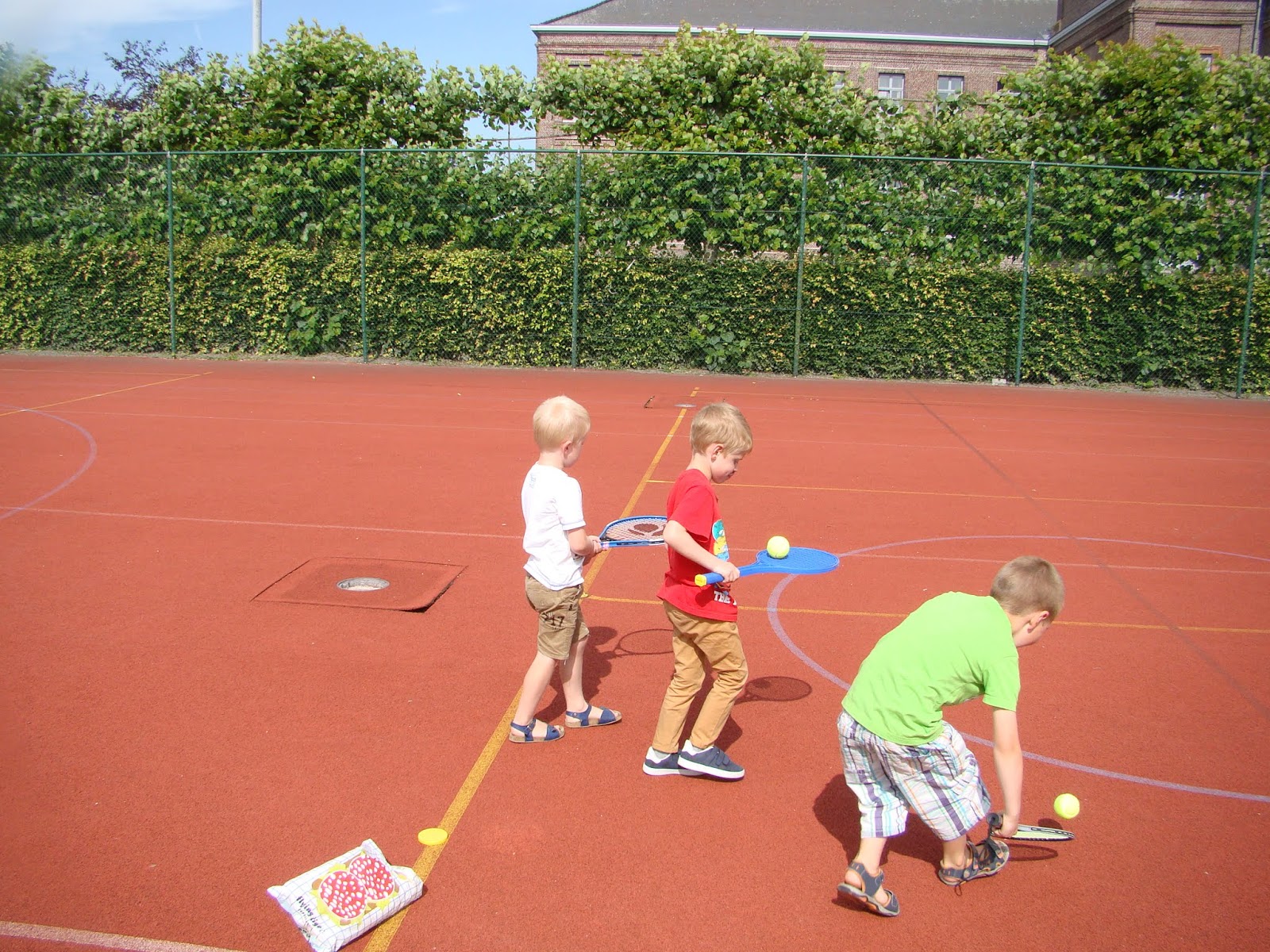 Ermée kwam ons een en ander vertellen over tennis. Na de opwarming mochten we proberen om naar de overkant te stappen met de bal op het racket en nog meer oefeningen. We stuiterden de bal naar een vriendje en leerden een opslag geven. Leerrijk en leuk! Bedankt voor de les en de tennisbal!